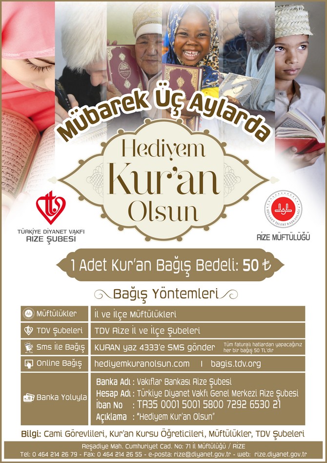 Çakmakçı, ‘Hediyem Kur’an Olsun’ projesi kapsamında bir kişinin daha Kur’an-ı Kerim ile tanışmasına vesile olmak isteyen vatandaşlarımızın TDV Rize Şubesinin banka hesabına bağış yapabileceğini ayrıca KURAN yazıp 4333’e SMS göndererek 50 TL tutarında 1 adet Kur’an bağışlayabileceklerini veya online olarak bagis.tdv.org adresi üzerinden ve bankalar yoluyla projeye destek olabileceklerini söyledi.