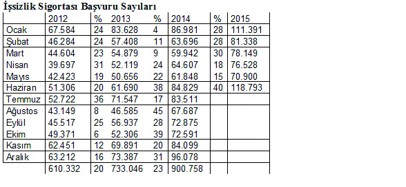 Tablodan da görüleceği üzere Haziran 2015 ayında işsizlik ödeneği alma başvurusunda Haziran 2014 ayındaki başvurulara göre yüzde 40’lık bir artış yaşanmış durumda. Bir başka deyişle işten çıkarma olaylarında büyük bir artış yaşanmış. Getirilen onca teşviğe karşın işten çıkarmanın bu derecelere gelmesi bu konuda alınması gereken önlemlerin ciddiyetini ortaya koyuyor. 2012 ve 2013 yıllarından beri rakamların değişimine dikkat edilirse zaten bir artış trendine çok önceden girildiği görülüyor.