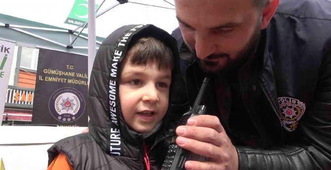 Gümüşhane'de Polis Haftası ve Türk Polis Teşkilatı'nın 177. kuruluş yıldönümü çeşitli etkinliklerle kutlanıyor. İl Emniyet Müdürlüğü de etkinlikler kapsamında Fatih Parkı'nda bağlı birimlerine ait stantlar kurdu. Kurulan stantlarda birimlerin çalışma sistemine dair vatandaşlara ve çocuklara bilgiler verildi. Etkinlikler kapsamında, polis telsizlerini kullanmayı öğrenen çocuklar ise telsiz kullanırken polislerden şeker istedi. Telsizin diğer ucunda görevli Yunus Polisi İlkay Yaş ve bir kadın polis bu isteği kırmayarak çocuklara şeker verdi. Mutlulukları gözlerinden okunan çocuklar, polis abilerine ve ablalarına teşekkür ederken, polis haftasını kutlamayı da unutmadı.