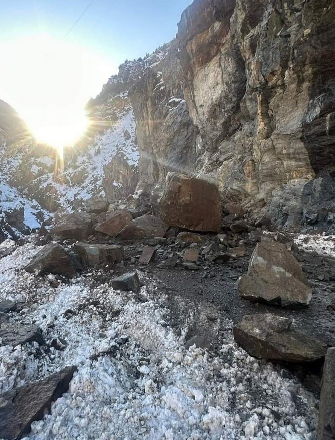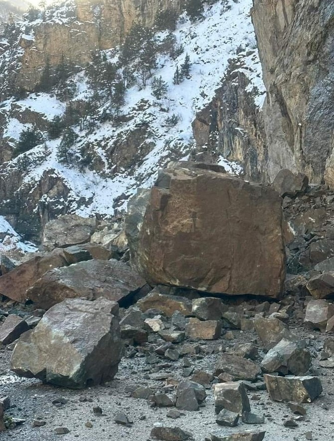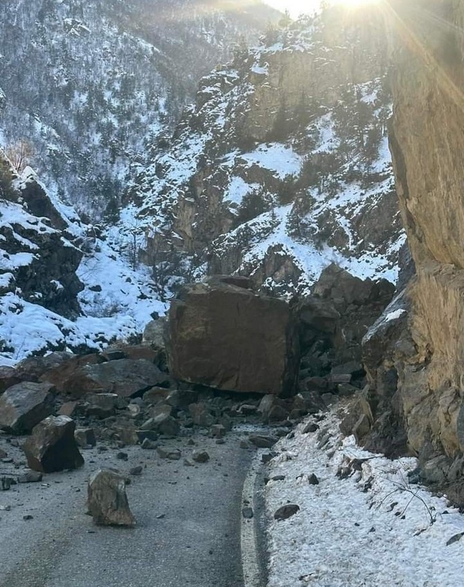 Yamaçtan büyük kaya parçalarının koparak düştüğü kara yolu ulaşıma kapandı. Çift taraflı trafiğe kapanan yolda kalan araçlar uzun kuyruklar oluşturdu.