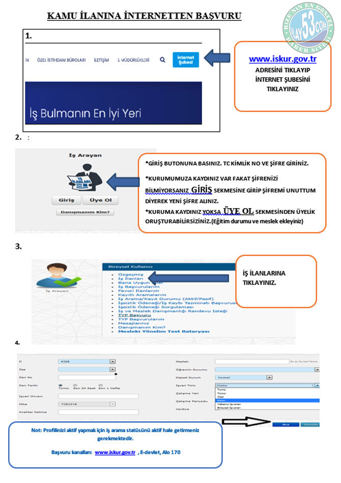 İnternetten başvuru yapabilmek için eğer İŞKUR’a kaydınız yoksa İŞKUR’un internet sitesi https://esube.iskur.gov.tr/ adresi üzerinden “üye ol” seçeneğini tıklayarak ve gerekli bilgileri doldurarak kaydınızı yapmanız gerekmektedir. Akabinde özgeçmiş sayfanızda yer alan “öğrenim bilgileri” ile “meslek bilgileri” alanlarını doldurmanız ve “kişisel bilgiler” alanında yer alan “İş Arama Statüsü”ne tıklayarak iş arama statünüzü aktife almanız gerekmektedir. Ayrıca, varsa ilgili mesleğe ilişkin iş tecrübesi, sürücü belgesi, yabancı dil ve sınav bilgileri gibi diğer bilgiler de eklenebilir. İlana başvuru yapmak için sertifika isteniyorsa ek özellik kısmında yer alan nitelik sekmesine girilerek mesleki belge ve sertifikanızı ekleyebilirsiniz. Engelli, eski hükümlü, terörle mücadelede malul sayılmayacak şekilde yaralanan (TMY) statüsünde iseniz veya kamu ilanlarına öncelik hakkı ile başvuru yapmanıza neden olan bir durumunuz var ise gerekli bilgileri ve belgeleri özgeçmişinizde yer alan “Kişisel Durum” alanına eklemeniz gerekmektedir. Sisteme yüklemeniz sonrasında belgeniz gerekli şartları sağlıyor ise il müdürlüğü/hizmet merkezi yetkilileri tarafından onaylanacaktır. Onay işlemi yapıldıktan sonra kişisel durumunuza uygun kamu ilanlarına başvuru yapabilirsiniz. Onay işlemi yapılmadan engelli, eski hükümlü, TMY statüsündeki ilanlara veya ilanların öncelikli listelerine başvuru yapılamaz. Özgeçmiş sayfanızı doldurduktan ve iş arama statünüzü aktife aldıktan sonra iş arayan sayfanızda “İş İlanları” sekmesine tıklayarak ilgili ekranda bulunan “İşyeri Türü ” kutucuğunda “Kamu”yu, “İli” kutucuğunda Rize, Artvin, Trabzon, Giresun illerinden şartlarınız hangisine uygunsa o ili seçerek ara butonuna tıklayarak arama yapabilirsiniz. İlgili ilanın üstüne tıkladığınızda ise ilana ilişkin detaylı bilgilerin (genel hususlar, özel şartlar, meslek, öğrenim ve kişisel özellikler vb.) yer aldığı ilan detayına ulaşabilirsiniz. İlana ilişkin detayları inceledikten ve başvuru şartlarını karşıladığınızdan emin olduktan sonra aşağıda ekran görüntüsünde gösterilen ve verdiğiniz bilgilerin doğru olduğunu ifade eden taahhüt metnini işaretleyip başvur butonuna tıklayarak başvurunuzu tamamlayabilirsiniz.