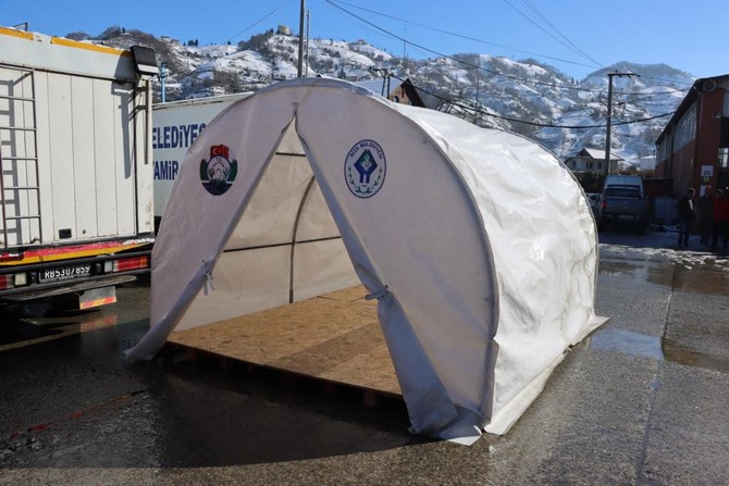 Açıklamada, Valilik koordinesinde başta Rize Belediyesi olmak üzere ilçe ve belde belediyeleri, kaymakamlıklar, sivil toplum örgütleri, gönüllü iş insanları ve vatandaşların katkıları ile tamamlanan çalışmalarda araç konvoyunun lokasyona ulaşması ile hızlıca bir şekilde çadır kent kurulmaya başlandığı ve çadır kentin kısa sürede depremzede vatandaşlara hizmet vermeye başlayacağı kaydedildi.