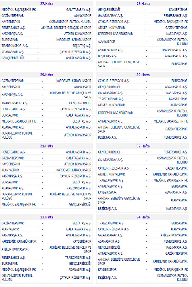 Ligde ilk yarının son derbisinde ise 13. haftada Fenerbahçe ile Beşiktaş, Ülker Stadı'nda karşı karşıya gelecek. Bu derbinin rövanşını ise takımlar 30. haftada oynayacak.