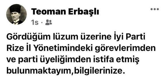 İYİ Parti Rize İl Kurucularından ve İl Yönetim Kurulu Üyesi Teoman Erbaşlı, il yönetim kurulu üyeliği ile parti üyeliğinden istifa ettiğini sosyal medyadan açıkladı. Erbaşlı, sosyal medyadan yaptığı açıklamada “Gördüğüm lüzum üzerine İYİ Parti Rize İl Yönetimindeki görevlerimden ve parti üyeliğimden istifa etmiş bulunmaktayım, bilginize.” ifadelerini kullandı.