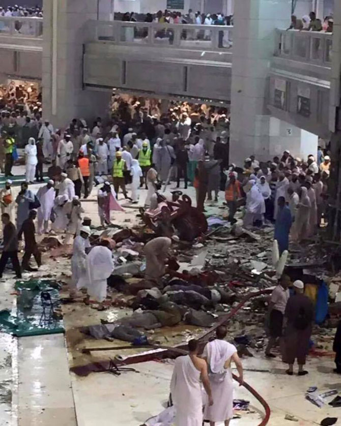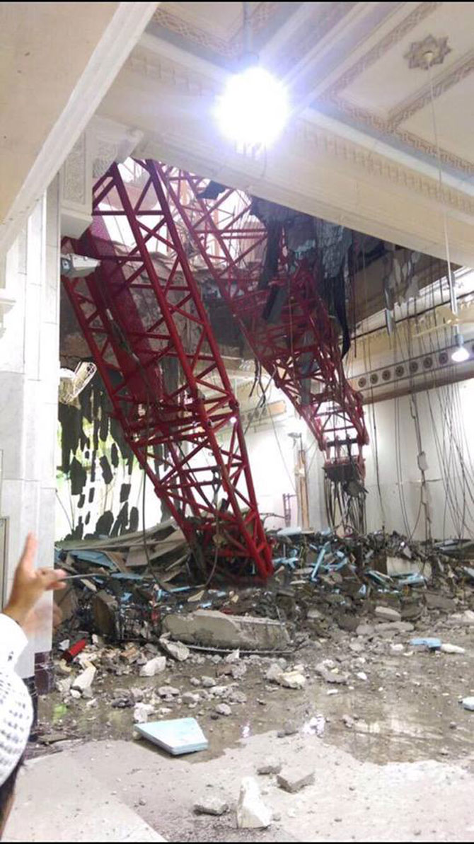 Mekke'deki sağanak yağış ve fırtına nedeniyle Mescid-i Haram'da bulunan bir vinç hacı adaylarının üzerine düştü. Feci kaza ile ilgili açıklama yapan Suudi Sivil Savunma Kurumu, ölü sayısının en az 62, yaralı sayısı ise 30 olduğunu bildirdi. Ölü sayısında artış olabileceği kaydedildi.