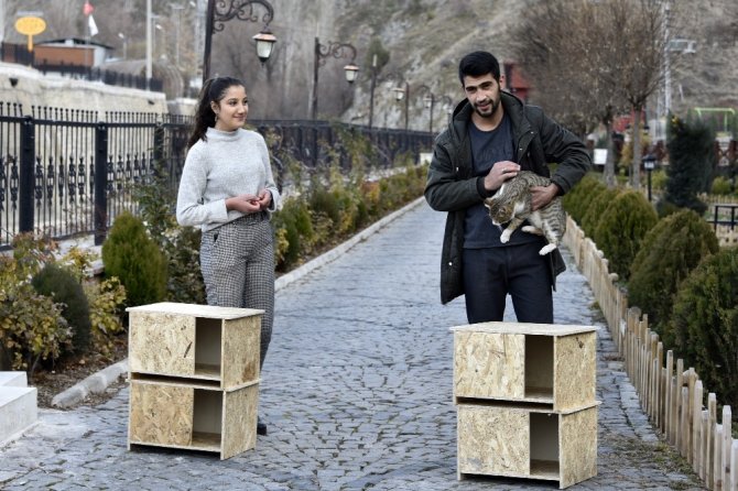 Gümüşhane'de iki üniversite öğrencisi "Soğuk havalarda kediler üşümesin" diye yaptırdıkları 30 kedi evini kentin değişik noktalarına yerleştirdi.