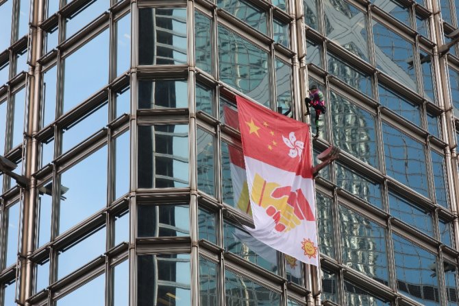 "Örümcek Adam" olarak bilinen bir Fransız dağcı Alain Robert, siyasi huzursuzlukla sarsılan Hong Kong'da bir gökdelene tırmandı. Robert şehir merkezinde büyük finansal kuruluşların yer aldığı 68 katlı "Cheung Kong Center" adlı gökdelene çıktıktan sonra bir afiş astı.