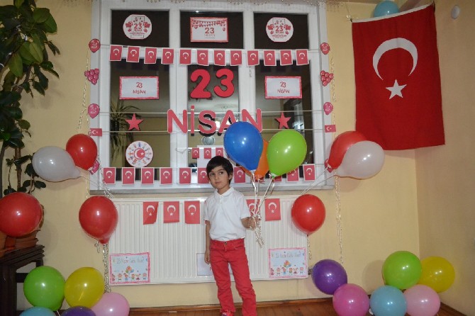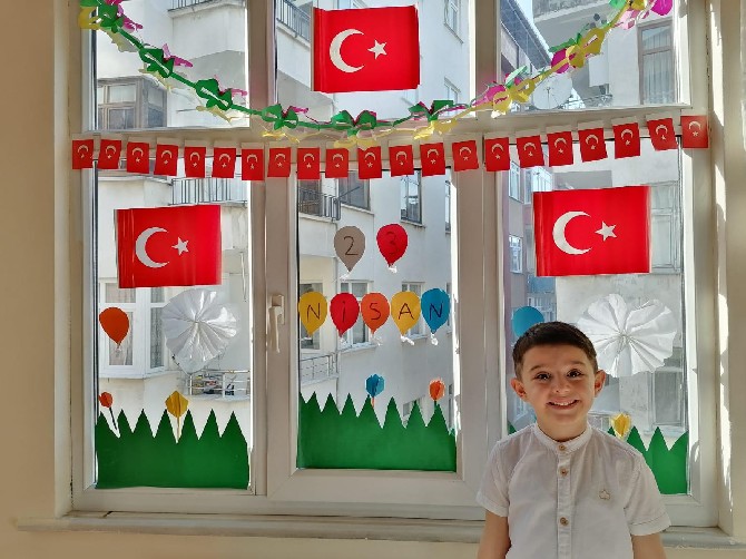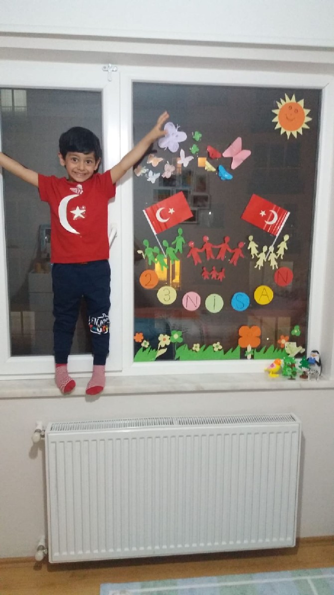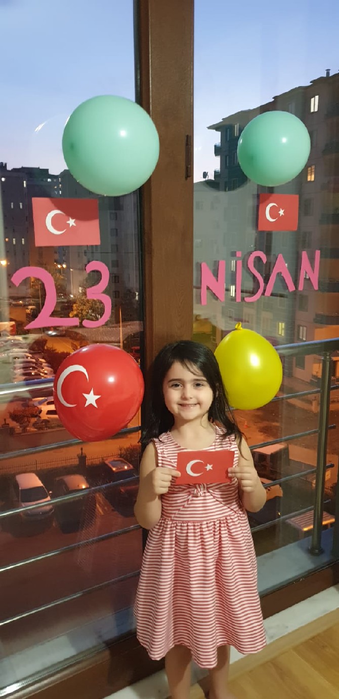 Türk bayrağı, kırmızı beyaz balonlar ve "23 Nisan bayramımız kutlu olsun." yazılı afişler hazırlayarak evlerini süsleyen çocukların "Evde kal." çağrılarının yer aldığı görüntüleri, velilerce kaydedildi.