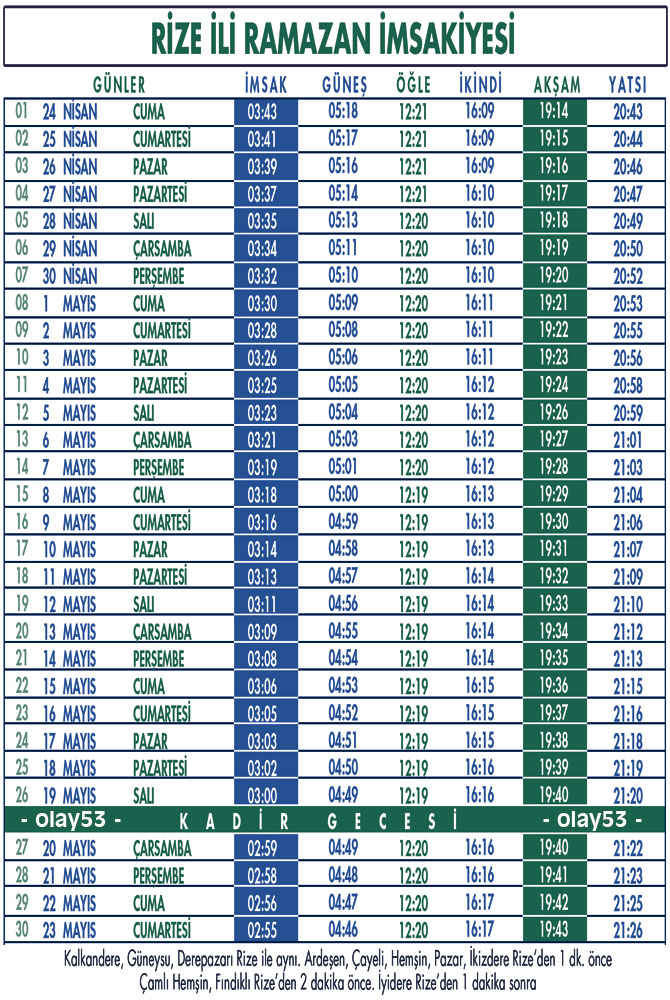 Rize’nin 2020 Yılı Ramazan İmsakiyesi